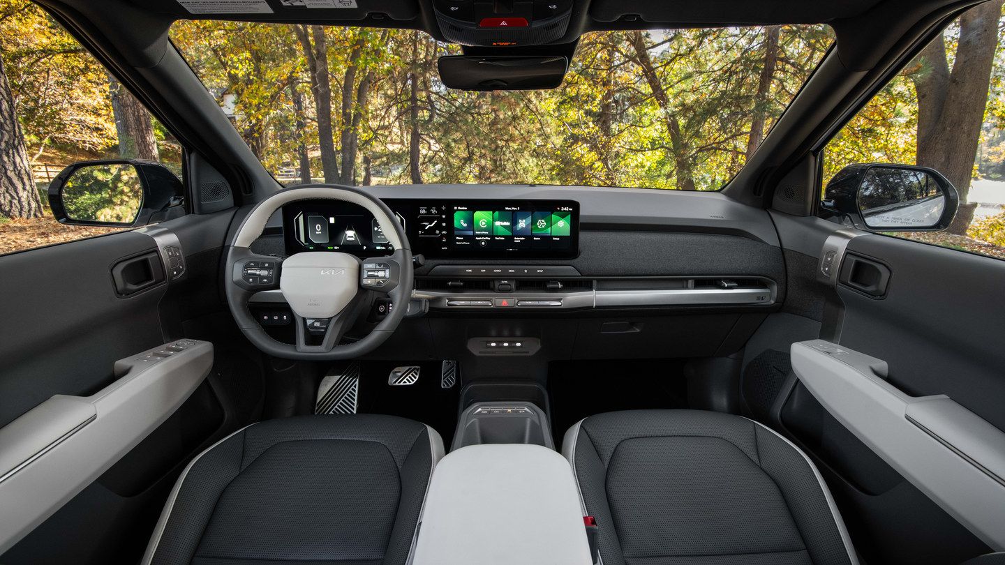 The EV3's cabin features a panoramic display spanning nearly 30 inches - the same setup as the larger EV9. It includes dual 12.3-inch displays (instrument cluster and infotainment) plus a 5-inch climate control screen. The system runs Kia's Connected Car Navigation Cockpit (ccNC) with over-the-air updates, wireless smartphone charging, and Digital Key 2.0.